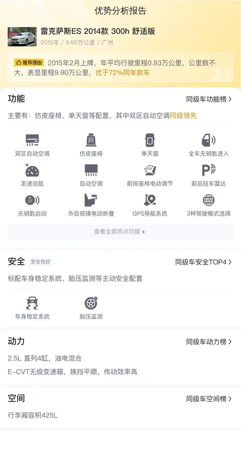 据估算,雷克萨斯ES 2014款 300h 舒适版的用车成本是12465元/年,同级车最低是10468元/年,最高是21364元/年,所以用车成本不算低。