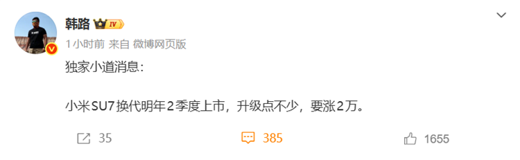 在价格方面,虽然韩路称会涨价2万,但别忘了,当初小米SU7上市前,韩路还曾预测小米SU7起售价可能超过30万元,但最终小米SU7标准版21.59万元起售,Max版本定在29.99万元起售,与韩路的预测差异还是比较大的。
