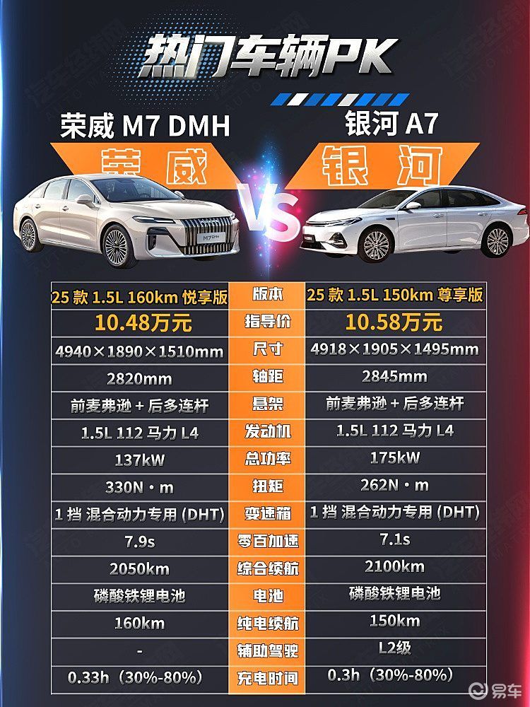 荣威M7 DMH 2025款160km悦享版指导价为10.48万元,吉利银河A7 2025款EM-i 150km尊享版指导价为10.58万元,两款车售价接近,均定位于B级家用轿车,那么哪一款车更值得入手呢?