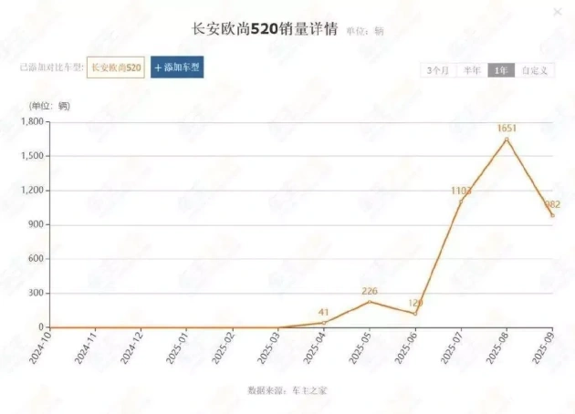 长安欧尚品牌曾凭借精准定位与长安品牌背书,在细分市场迅速占有一席之地。然而步入新能源时代,其转型步伐显得迟缓,市场反馈并不理想。例如今年4月推出的紧凑型纯电轿车——长安欧尚520,在9月销量仅982辆,环比下滑40.52%,上市不足半年已显边缘化。