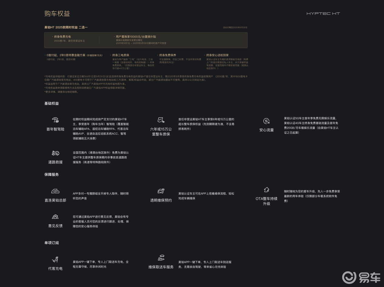 昊铂HT提供了首任非运营车主终身免费充电(2000度/年)以及10000元/台置换补贴两项限时权益,用户可以在二者之间进行二选一;
