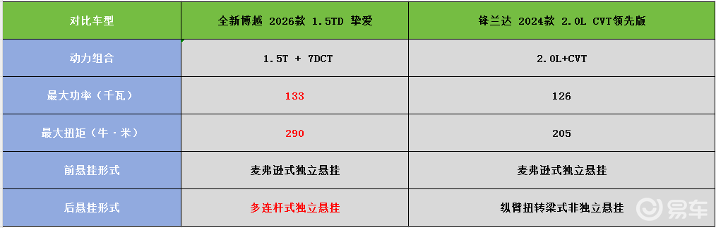 锋兰达采用 2.0L 自然吸气发动机,与之匹配 CVT 无级变速 (模拟 10 挡),最大功率和最大扭矩分别为 126kW、205N・m,相比之下,全新博越的动力输出更强劲,无论是市区急加速还是高速超车,博越都能给你更有底气的驾驶体验。并且,全新博越采用后多连杆式独立悬架,相比锋兰达的后扭力梁式非独立悬架,在过一些颠簸路面或者减速带时,博越能更好地过滤震动,让车内乘客感觉更舒适,行驶稳定性也更好。