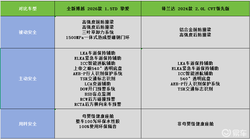 最后再讲讲用料安全。车内环境的安全同样不容忽视,毕竟我们大部分时间都在车内。锋兰达采用的是非母婴级健康座舱。全新博越则打造了母婴级健康座舱,整车 100% 使用环保水性胶,隔音材料也 100% 采用环保材质,能有效减少车内异味和有害气体的产生,给车内乘客,尤其是老人、小孩和孕妇,提供一个更健康、舒适的乘车环境。