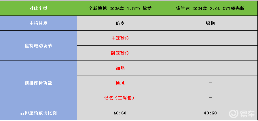 说到乘坐舒适性就还要聊聊车辆的座椅舒适性配置。全新博越采用皮质座椅,而锋兰达为织物座椅。另外全新博越前排座椅均支撑电动调节,支持加热、通风和记忆(主驾驶),而锋兰达所有座椅只能手动调节,也没有配置加热、通风功能。相对来说全新博越在使用便捷性和舒适性上更胜一筹储物空间方面,全新博越的车内储物空间多达 37 处,像一些小物件,比如手机、水杯、雨伞啥的,都能找到合适的地方放置:椅背地图袋可放旅行攻略,顶棚上挂钩、B柱上挂钩可挂摄影器材包,门饰板上下储物盒、双手机储物盒等多种秘密空间可满足各类储物需求。