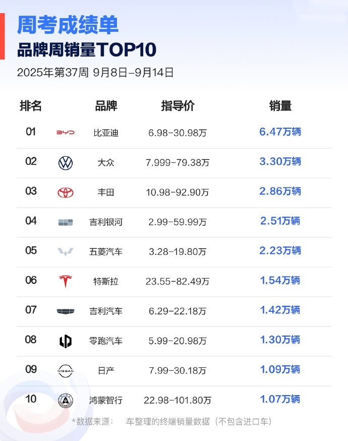 上周零跑汽车以1.3万辆成绩稳居新势力品牌销量头名,是新势力少有销量过万的品牌;并且在新能源品牌中稳居前五,力压由“界字辈“组合而成的鸿蒙智行(1.07万辆);同时在所有汽车品牌中销量稳居前十,已超越日产汽车(1.09万辆)在中国市场的终端销量;