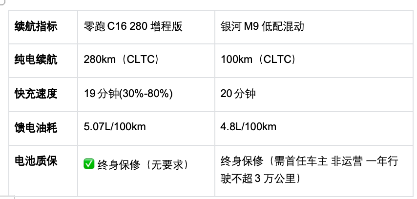 银河M9 5205mm的大车身能不能满足6人出行?能!那么零跑C16 4915mm的尺寸能不能满足6人出行,其实也能!但是在出行过程中,家人朋友通过车辆配置差异获得的体验感与满足感,却是不尽相同的。所以结论很简单了,想买银河M9,最好手持23万的预算再做考虑。如若只能拿出17-18万的预算来买车,那么零跑C16显然是更理智的选择。
