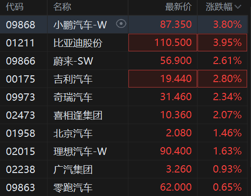 港股汽车股集体反弹,其中,小鹏汽车、比亚迪股份涨约4%,蔚来汽车、吉利汽车涨近3%,奇瑞汽车涨超2%,北京汽车、广汽集团、零跑汽车、理想汽车跟涨。