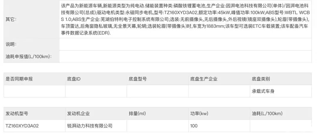 动力方面,新车将搭载由锐湃动力科技有限公司生产型号为TZ160XYD3A02驱动电机,提供两种动力版本,均采用前驱布局,其中,入门版电机最大功率为100kW;高功率版电机最大功率为165kW。