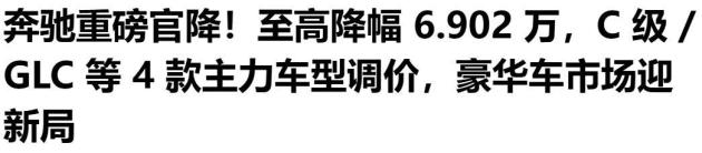 据悉,2月1日,多家媒体报道,奔驰汽车对部分车型的厂商建议零售价进行了调整,涉及车型的调整幅度约为10%左右。其中,C级、GLB、GLC等主力车型的最高降价幅度达到6.9万元,入门款价格跌破30万元大关。
