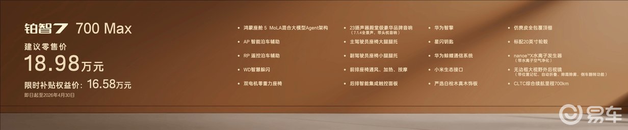 此次铂智7的定价堪称诚意十足,相比预售价格直降1万元,真正做到了"D级车享B级价"。入门版600 Pro限时补贴权益价仅14.78万元,却能拥有同价位最大的旗舰轿车尺寸,以及鸿蒙座舱5、华为智擎、星闪钥匙、实木内饰、座椅通风加热等超15项豪华配置,将入门即豪华的体验落到实处。即便是顶配的710 Ultra激光雷达版,限时价也仅19.98万元,集齐双腔空悬、激光雷达智驾、27英寸全景HUD、NAPPA真皮座椅等满配豪华配置,让20万内买纯电旗舰从奢望变成现实。