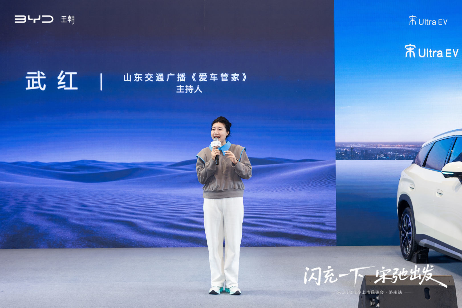 现场的媒体与车主证言,更是让宋 Ultra EV 的产品实力得到了真实印证。山东交通广播《爱车管家》主持人武红从专业视角出发,深度解读了车型在闪充效率、续航表现、智能安全、空间实用性等方面的核心优势,认为宋 Ultra EV 不仅解决了新能源用户的补能与里程双重焦虑,更为区域家用纯电市场树立了全新标杆。
