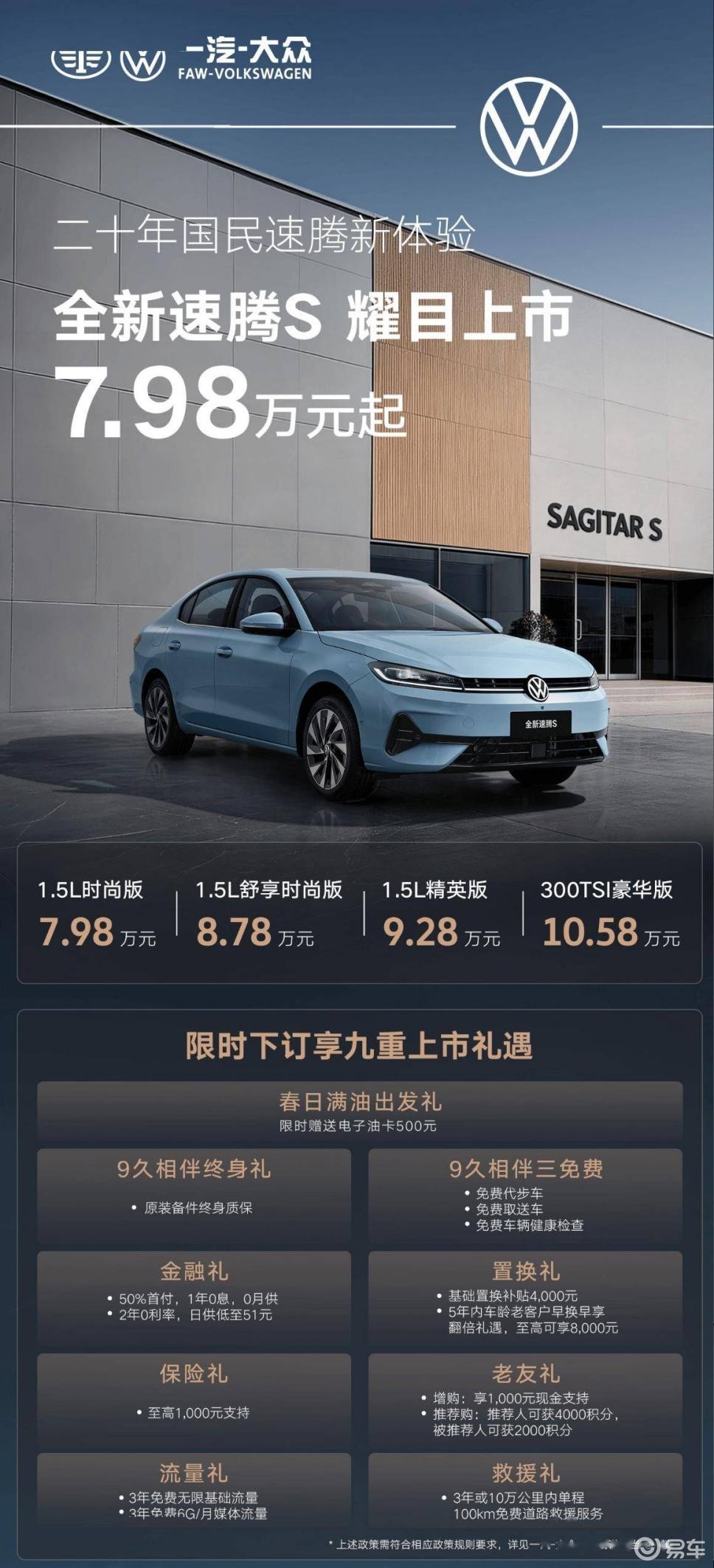 为了让用户买车放心、用车安心,一汽-大众推出“大众严选 9久相伴”专属政策,九大权益覆盖用车全生命周期,速腾S作为燃油车型,可享其中核心权益,真正做到“一次购车,长久守护”。