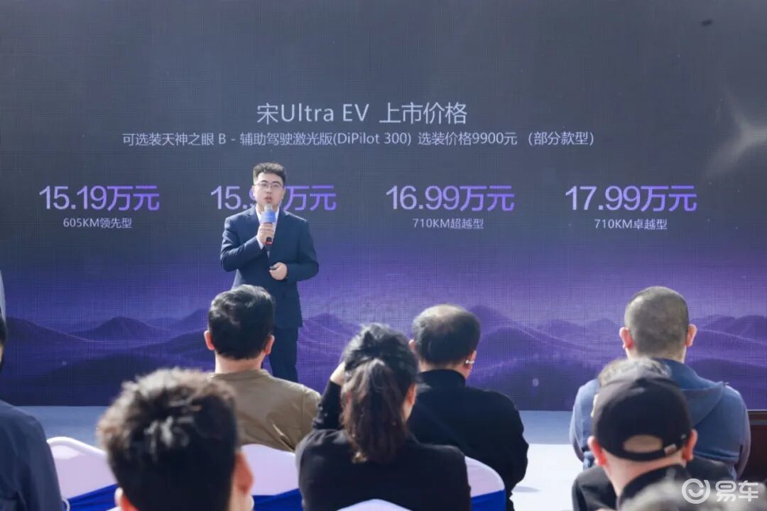 宋Ultra EV四款车型,从15.19万元的605KM领先型起步——第二代刀片电池、闪充技术、云辇-C、7安全气囊、电动尾门、15.6寸大屏、前排远端气囊……超100项配置,通通标配。