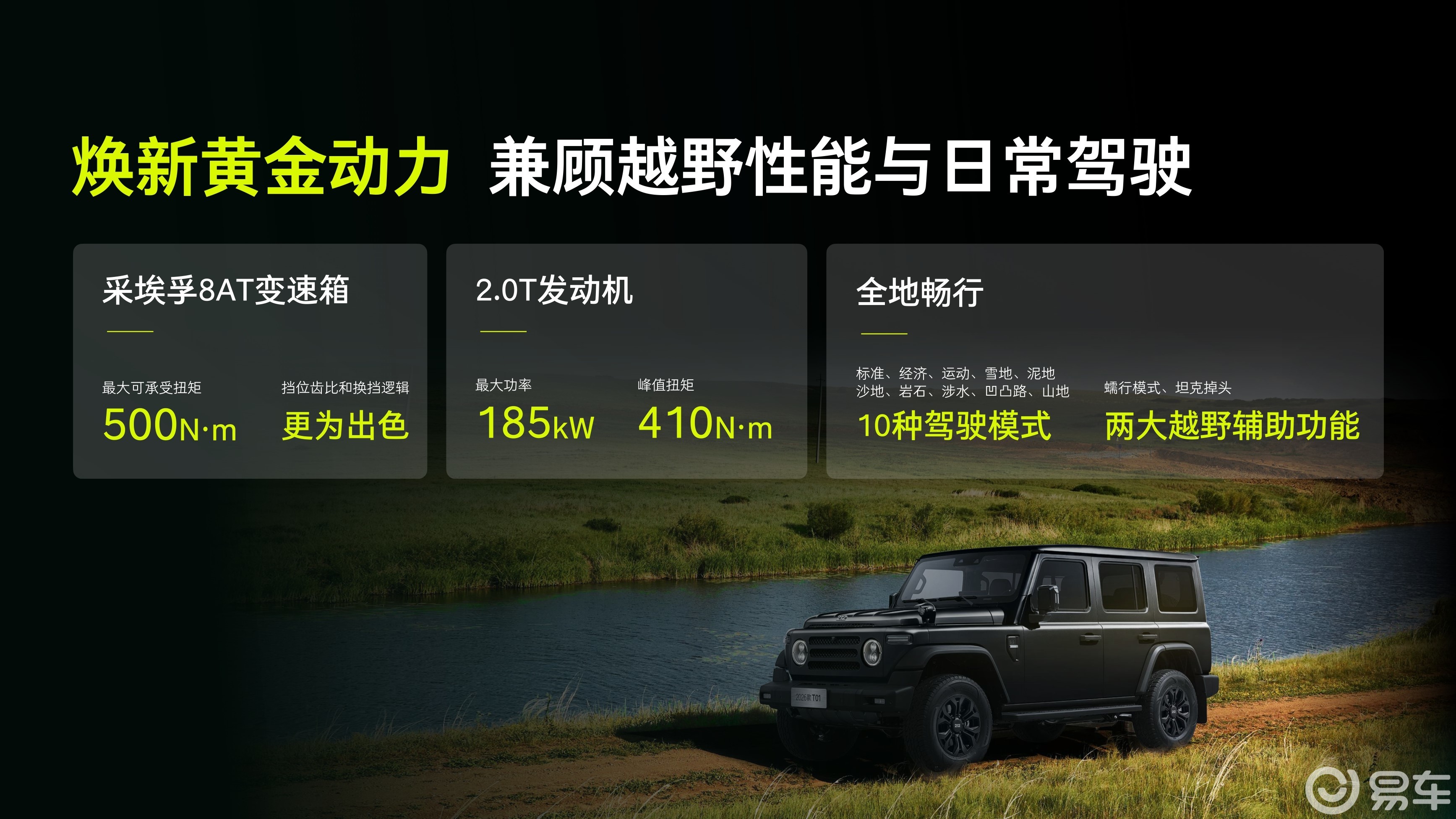 2026款T01全系标配采埃孚8AT变速箱及博格华纳分动器,低速四驱模式下扭矩放大至2.64倍。新车对NVH进行系统优化,其中“长风”版本新增高强度前方管桥。具体售价为:机械师14.99万元、检阅官16.99万元、长风19.48万元、高地20.88万元。